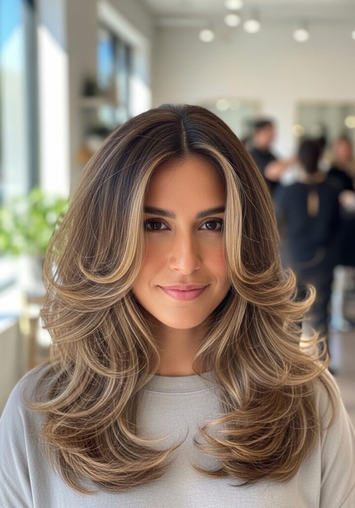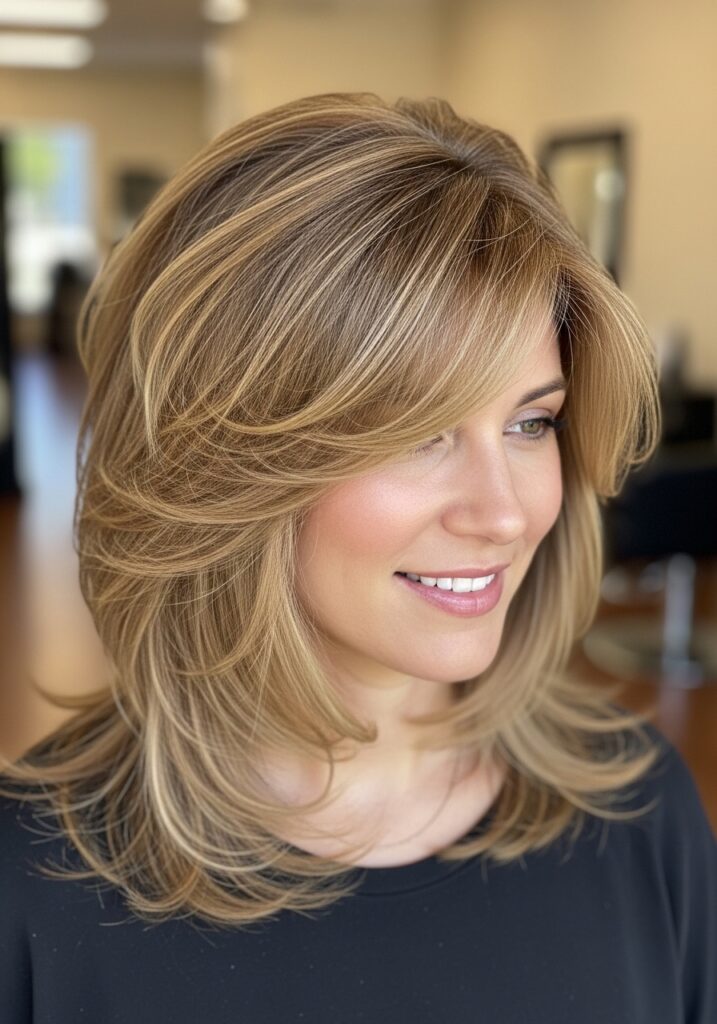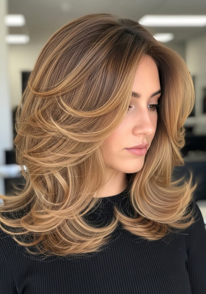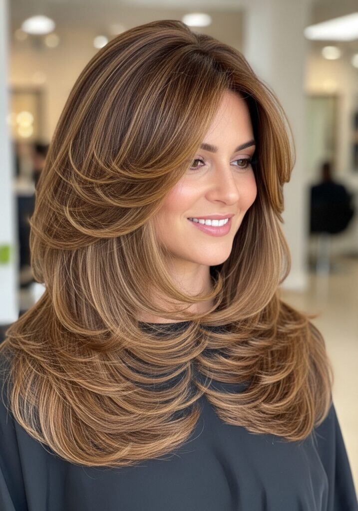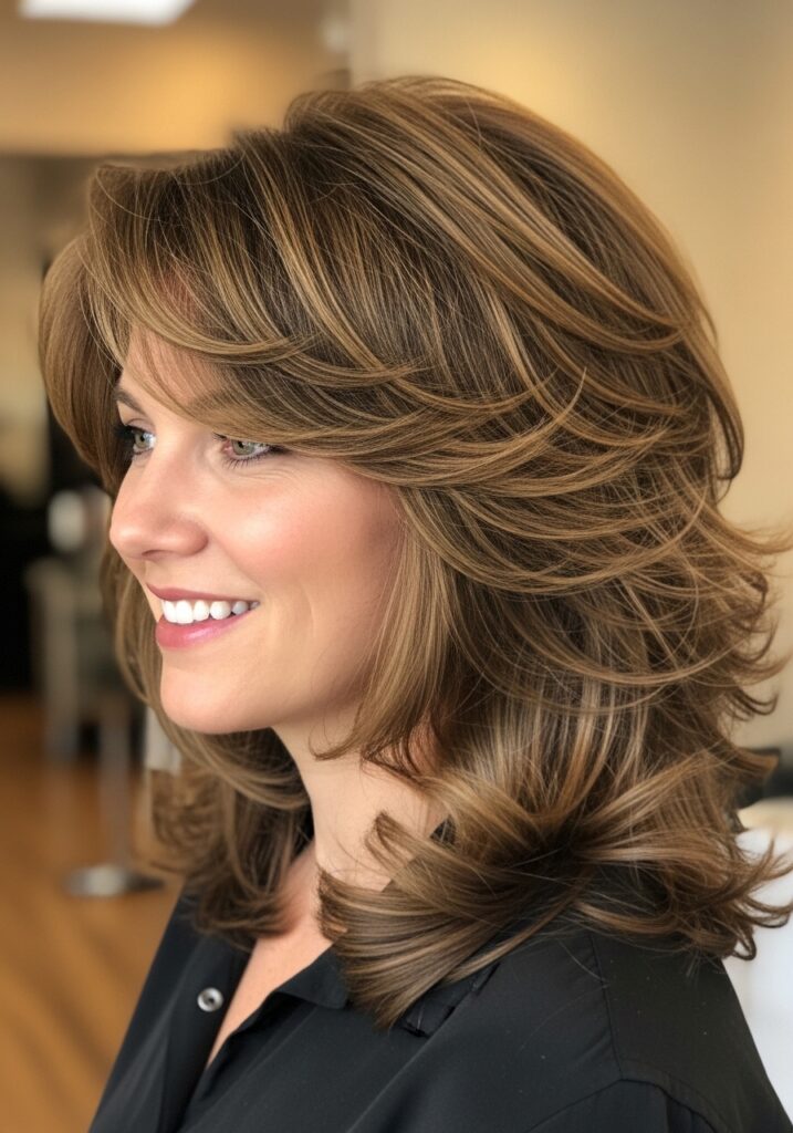 Feathered layered hair is a classic hairstyle that creates light, airy movement throughout the hair. Instead of heavy layers, feathered cuts use fine tapering techniques that make the ends appear soft and wispy. This styling approach allows the hair to fall naturally while adding instant volume. Feathered layers work especially well with medium and long hair because they enhance bounce and shape. When styled with a blow dryer and round brush, the layers lift beautifully away from the face. This hairstyle feels timeless yet modern, making it a favorite for women who love effortless volume.