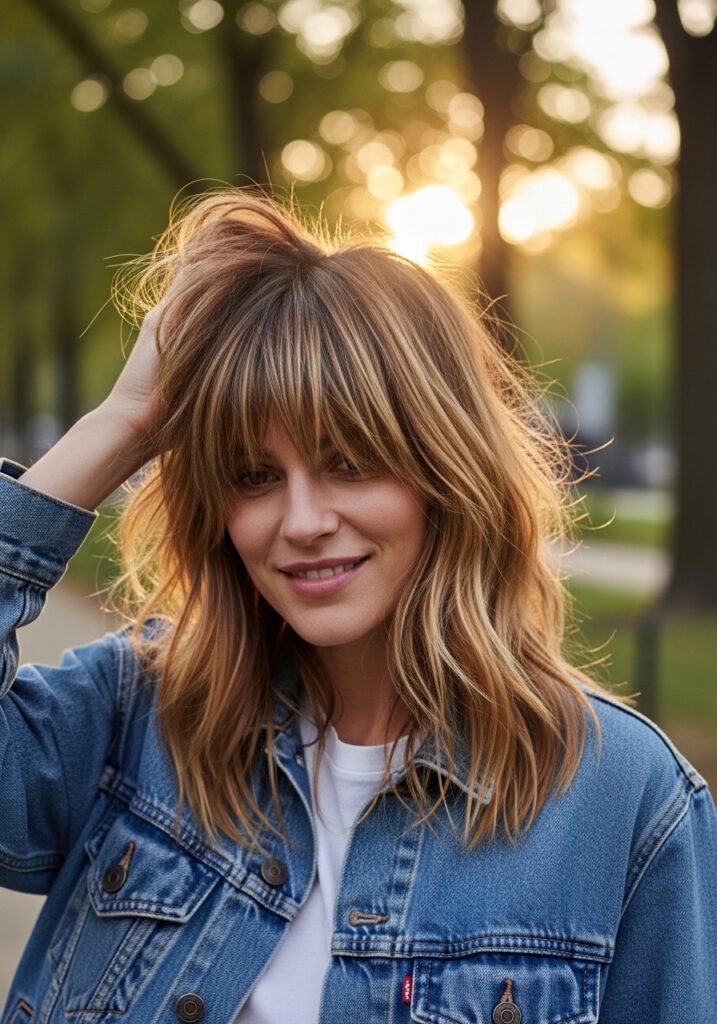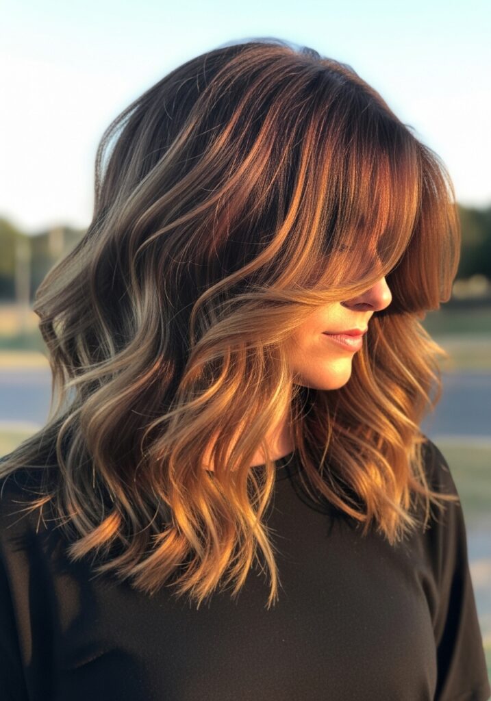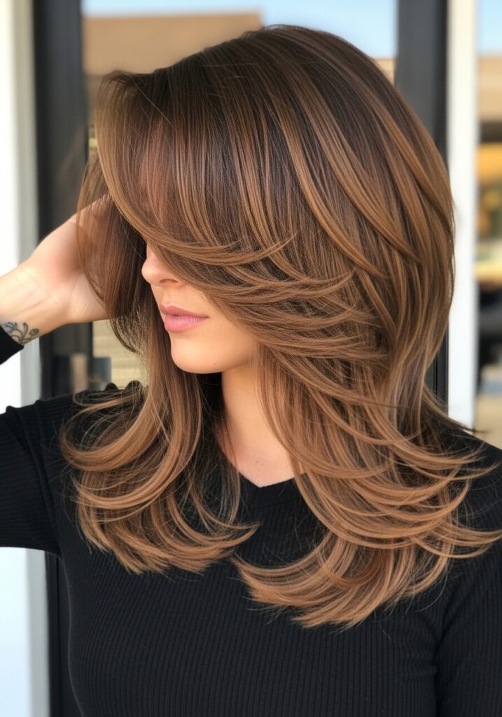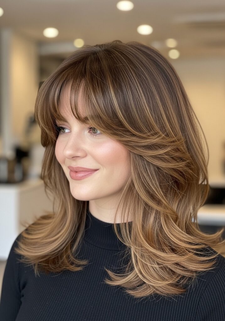 Layered face-framing bangs add softness and volume around the face, instantly enhancing hairstyle movement. This style works with medium to long hair and blends naturally into the rest of the layered haircut. The layers lift the hair near the crown and create bounce along the sides, preventing a flat appearance. Face-framing bangs are versatile, flattering most face shapes, and pair beautifully with waves, curls, or straight hair. This hairstyle is ideal for women seeking subtle volume, natural softness, and effortless elegance. It’s easy to maintain and enhances both casual and formal looks with minimal styling.