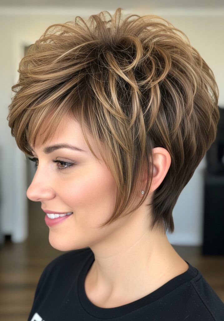 A layered pixie cut adds instant volume to short hair while maintaining a chic, modern silhouette. Layers at the crown lift the hair, creating texture and fullness. Side-swept bangs or soft fringe enhance face-framing effects. This haircut works especially well on fine hair, giving the illusion of thickness and movement. The layered pixie cut is versatile, allowing for sleek, polished styling or tousled, textured looks. Ideal for busy lifestyles, it requires minimal maintenance while offering maximum style. This haircut is perfect for women who want a bold, playful, and voluminous short hairstyle.