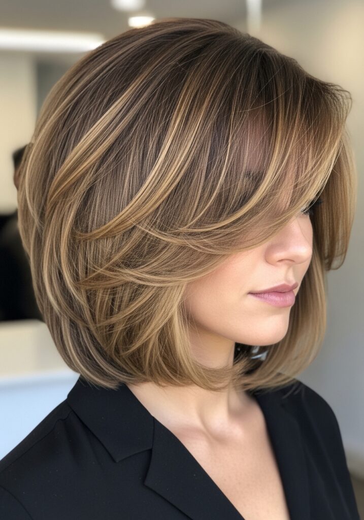 The layered angled bob is a modern take on the classic bob, featuring longer layers in the front and shorter layers in the back. This angled shape creates the illusion of fullness and movement while emphasizing facial features. Soft layers throughout the haircut prevent it from appearing flat or heavy. Styling with a round brush or curling iron enhances volume, giving the bob a polished, bouncy finish. The layered angled bob works beautifully on straight or slightly wavy hair and offers a chic, professional look suitable for work, social outings, or casual everyday elegance.