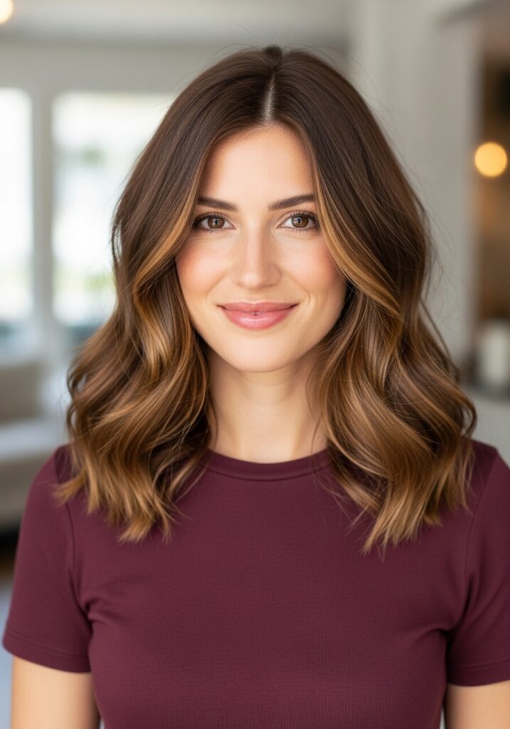 Loose shoulder-length waves create a relaxed hairstyle that feels modern and effortless. This look works beautifully for medium-length hair and adds soft movement without requiring complicated styling techniques. Use a curling wand to create gentle bends through the hair, focusing mainly on the mid-lengths and ends. Brush the waves lightly with your fingers to soften the shape. Apply a small amount of texture spray to enhance volume and hold. The result is a casual yet polished hairstyle that works for workdays, casual outings, and everyday moments when you want to feel confident and stylish.