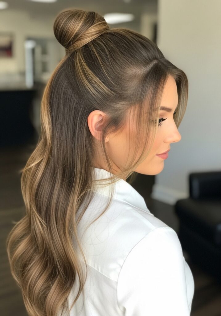 The half-up top knot is a playful hairstyle that blends casual comfort with stylish charm. This look allows you to keep hair away from your face while still showcasing its length and texture. Begin by gathering the top section of your hair and twisting it into a small bun at the crown. Secure the bun with a hair tie or pins while leaving the rest of your hair flowing naturally. The relaxed balance between up and down styling creates an effortlessly trendy look. This hairstyle works wonderfully for everyday errands, coffee dates, or relaxed creative work environments.