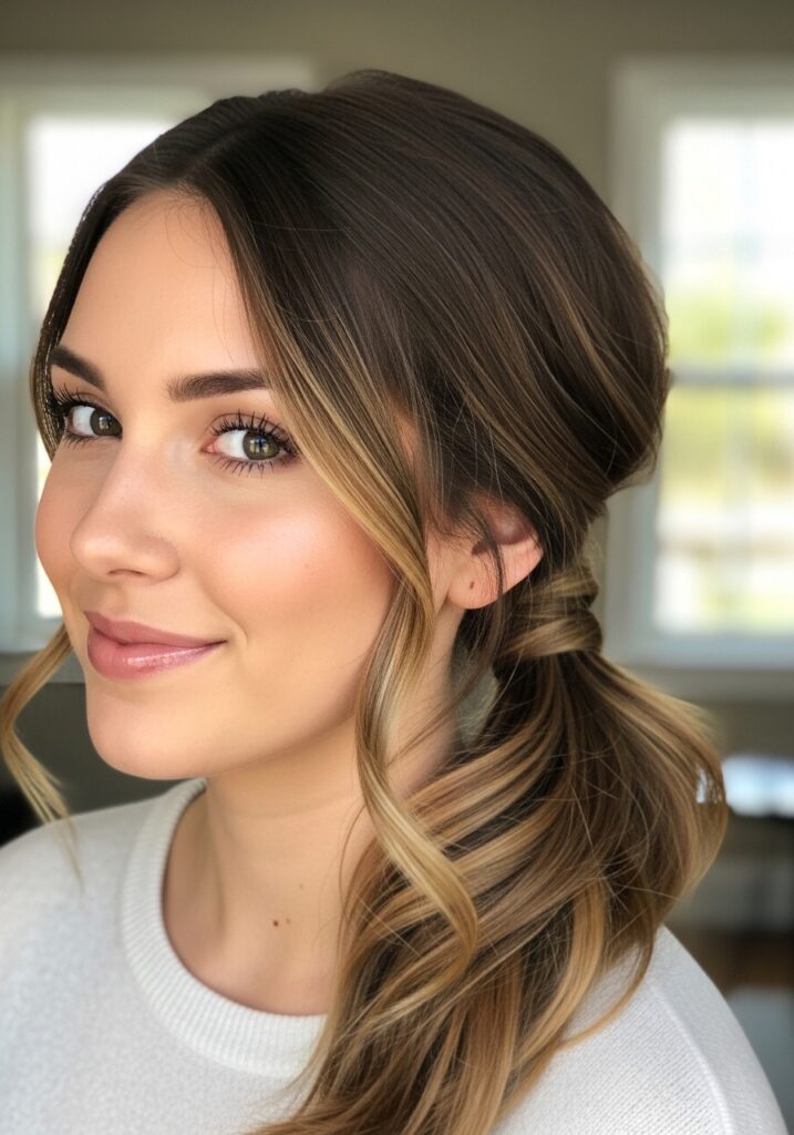 The twisted side ponytail is a charming hairstyle that adds a romantic touch to everyday styling. Start by parting your hair slightly to one side and gathering it over one shoulder. Take two small sections from the front and twist them gently toward the ponytail base. Secure everything together with an elastic band. The twisting detail adds elegance while keeping the hairstyle simple and quick to create. Soft waves can enhance the texture and volume of this look. The twisted side ponytail works beautifully for casual outings, relaxed workdays, or weekend brunch with friends.
