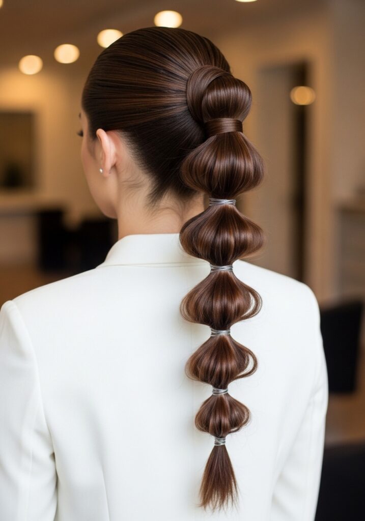 The bubble ponytail is a playful hairstyle that adds creativity to a simple ponytail. Start with a regular ponytail and place additional elastics down the length every few inches. Gently pull each section outward to create “bubble” shapes. This hairstyle is trendy, eye-catching, and surprisingly quick to create. It works especially well for long hair and adds volume without requiring heat styling tools. The bubble ponytail is popular on Pinterest because it looks unique while remaining easy enough for everyday wear.