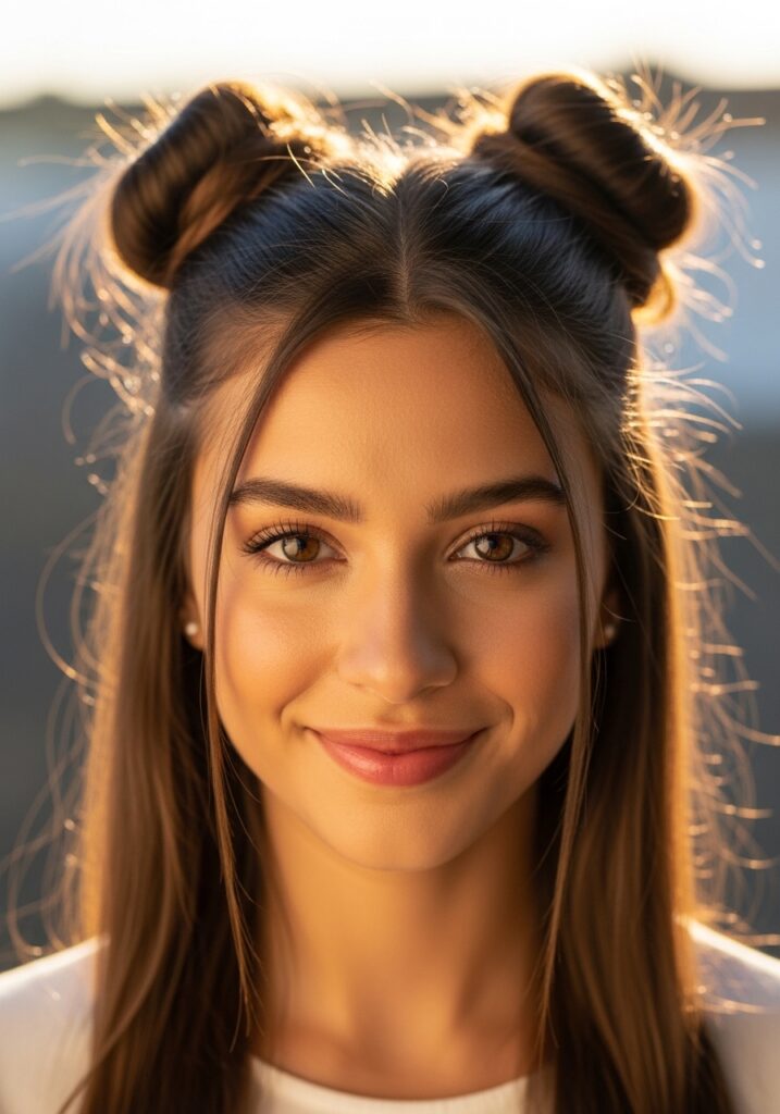 Double mini buns are a fun and youthful hairstyle that can be created very quickly. Divide your hair into two sections and twist each section into a small bun on either side of your head. Secure them with elastics or pins. This hairstyle is playful, trendy, and popular among fashion trends. It works best with medium or long hair and adds personality to your everyday style.