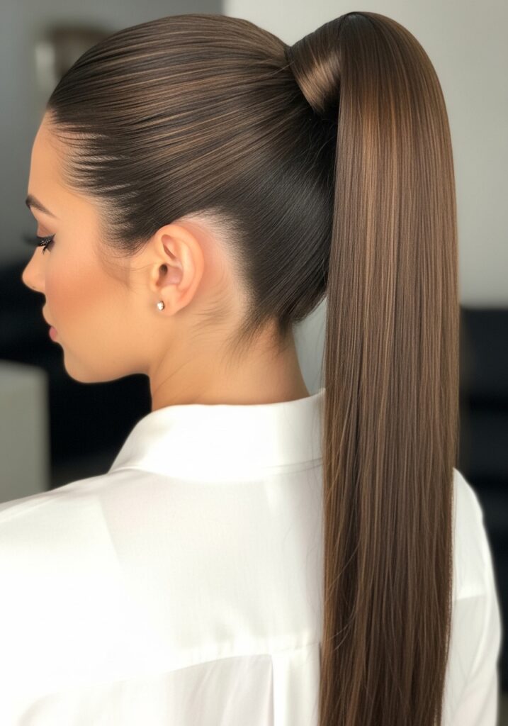 A high sleek ponytail instantly creates a confident and polished look while requiring very little time. Brush your hair upward toward the crown of your head and secure it with a strong elastic. Smooth flyaway with a small amount of hair serum or styling gel for a clean finish. This hairstyle works especially well for straight or slightly wavy hair and gives a lifted appearance that highlights your facial features. The high ponytail is ideal for workdays, gym sessions, or busy schedules when you need a quick yet powerful hairstyle that looks fashionable and energetic throughout the day.