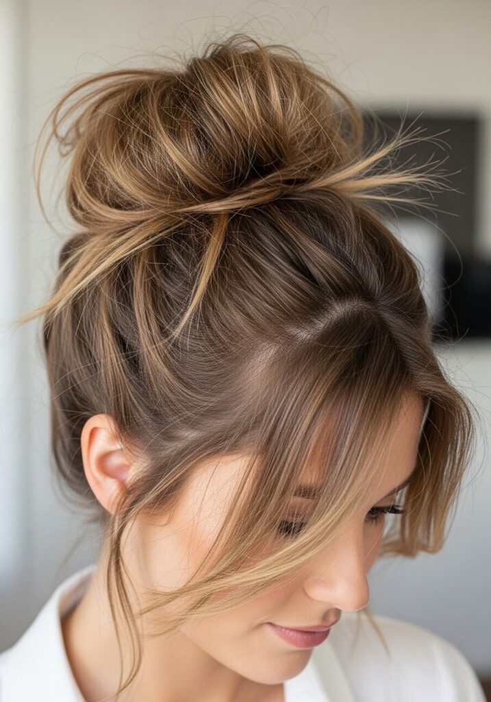 The messy high bun is a lifesaver when you are short on time but still want a stylish and trendy look. Gather your hair into a high ponytail and twist it loosely before wrapping it around the base to create a bun. Secure it with a hair tie or a few bobby pins. The beauty of this hairstyle is its effortless charm—loose strands around the face create a relaxed and fashionable appearance. This hairstyle works especially well for second-day hair because the natural texture adds volume. The messy bun is ideal for busy mornings, gym days, or casual outings when comfort and style matter.
