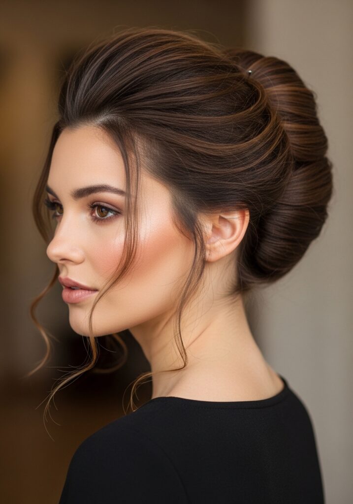 The quick French twist is an elegant hairstyle that can surprisingly be done in minutes. Gather your hair at the back, twist it upward, and tuck the ends inside before securing with pins. This hairstyle looks sophisticated and works perfectly for professional environments or formal occasions. The French twist keeps hair neatly in place while creating a graceful silhouette. It’s an excellent hairstyle when you need something polished but quick.