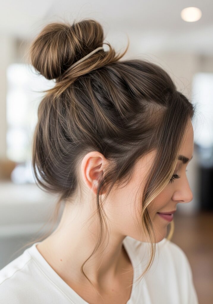 The top knot is a simple yet stylish hairstyle that works perfectly for rushed mornings. Gather your hair into a high ponytail and twist it around the base to form a bun at the crown of your head. Secure it with an elastic and a few pins if needed. This hairstyle keeps hair off your face and neck, making it comfortable and practical throughout the day. The top knot works best for medium to long hair and can look either sleek or messy depending on your preference. It’s ideal for work, errands, or casual outings.
