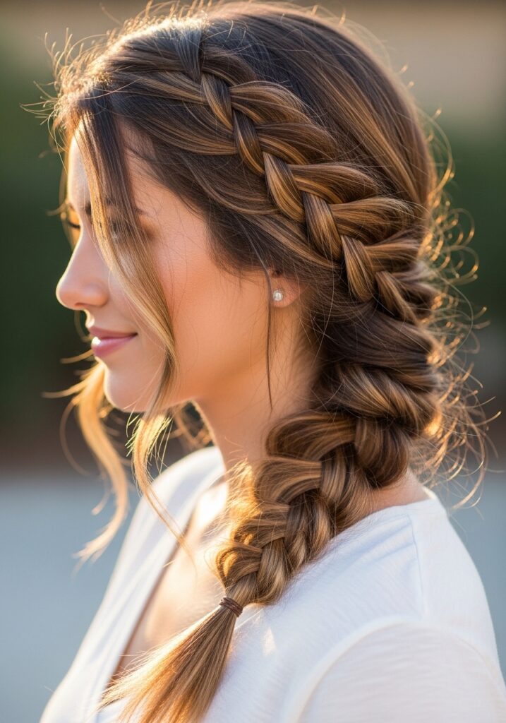 A simple side braid is a timeless hairstyle that combines practicality with beauty. Sweep your hair over one shoulder and create a loose three-strand braid, securing it with a small elastic at the end. This hairstyle keeps hair neat throughout the day while adding a soft, feminine touch. It’s perfect for busy mornings because it takes less than two minutes to complete and works well with slightly messy or textured hair. You can gently pull apart the braid sections to create a fuller, more relaxed appearance. This look is ideal for workdays, casual events, or quick morning routines.