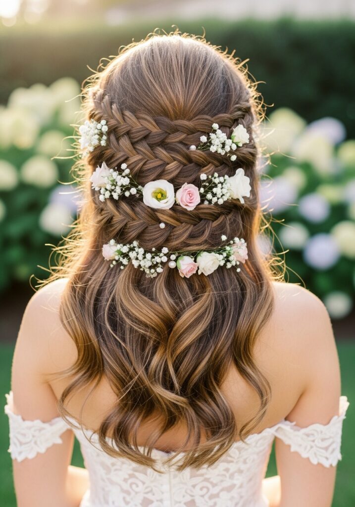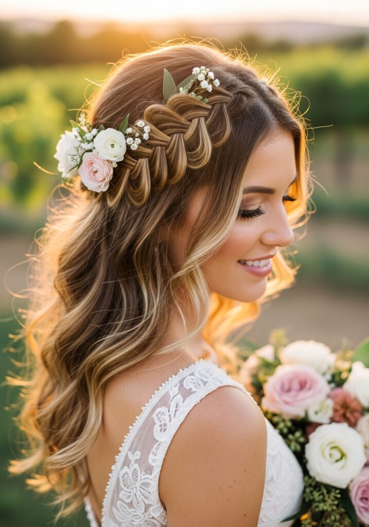 The boho braided crown with waves creates a dreamy hairstyle inspired by nature and romance. A soft braid wraps around the crown of the head while loose waves flow freely down the back. This combination creates balance between structure and movement, giving the bride a relaxed yet elegant appearance. Brides often add tiny flowers, pearl accents, or delicate hair vines to enhance the bohemian aesthetic. This hairstyle is perfect for outdoor weddings, beach ceremonies, and rustic venues. The braided crown with waves allows brides to look effortlessly beautiful while expressing a free spirited and romantic bridal style.