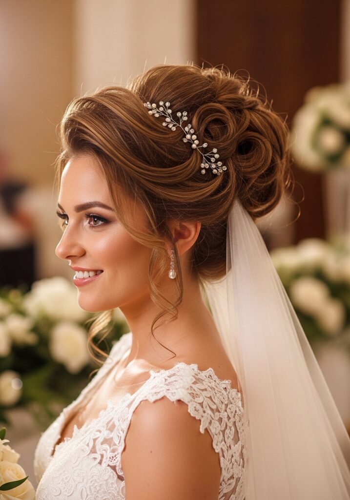 The voluminous bridal updo is a breathtaking hairstyle designed for brides who want dramatic elegance and luxurious texture. This style focuses on creating height at the crown while gathering soft curls into a beautifully sculpted updo. The gentle lift elongates the face and enhances the bride’s posture, creating a regal silhouette that looks stunning in wedding photography. Loose strands softly frame the face to keep the look romantic rather than overly structured. Brides often decorate this hairstyle with sparkling pins, crystal combs, or pearl accessories. The voluminous bridal updo pairs perfectly with classic gowns and grand venues, making brides appear confident, graceful, and unforgettable.