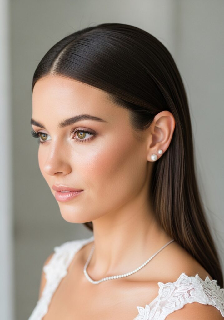 Minimalist straight bridal hair is perfect for brides who appreciate simplicity and modern elegance. Smooth glossy strands fall naturally while a clean center part creates a polished silhouette. The hairstyle highlights healthy hair texture and complements contemporary wedding gowns beautifully. Brides often add a delicate hair clip or veil to maintain the minimalist aesthetic. This style looks stunning in photographs because the shine reflects light softly. Minimalist straight hair proves that bridal beauty does not always require complexity. Instead, it celebrates natural elegance, allowing brides to appear confident, graceful, and effortlessly sophisticated on their special day.