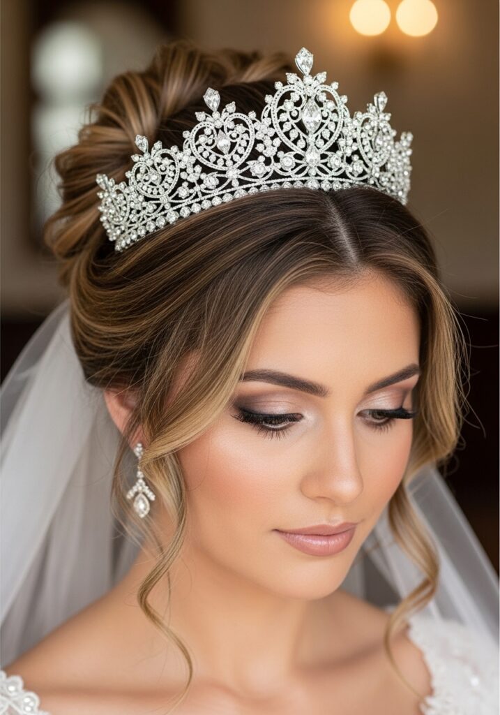 The regal bridal tiara updo is designed for brides who dream of a princess inspired wedding look. Hair is styled into an elegant updo that provides a stable base for a sparkling tiara. The hairstyle creates a graceful frame for the crown while maintaining softness and romance. Brides often combine this look with dramatic veils and luxurious gowns to enhance the royal aesthetic. The tiara catches light beautifully, making the bride appear radiant in photographs. This hairstyle symbolizes elegance, celebration, and confidence, allowing brides to feel truly special as they walk down the aisle on their unforgettable wedding day.