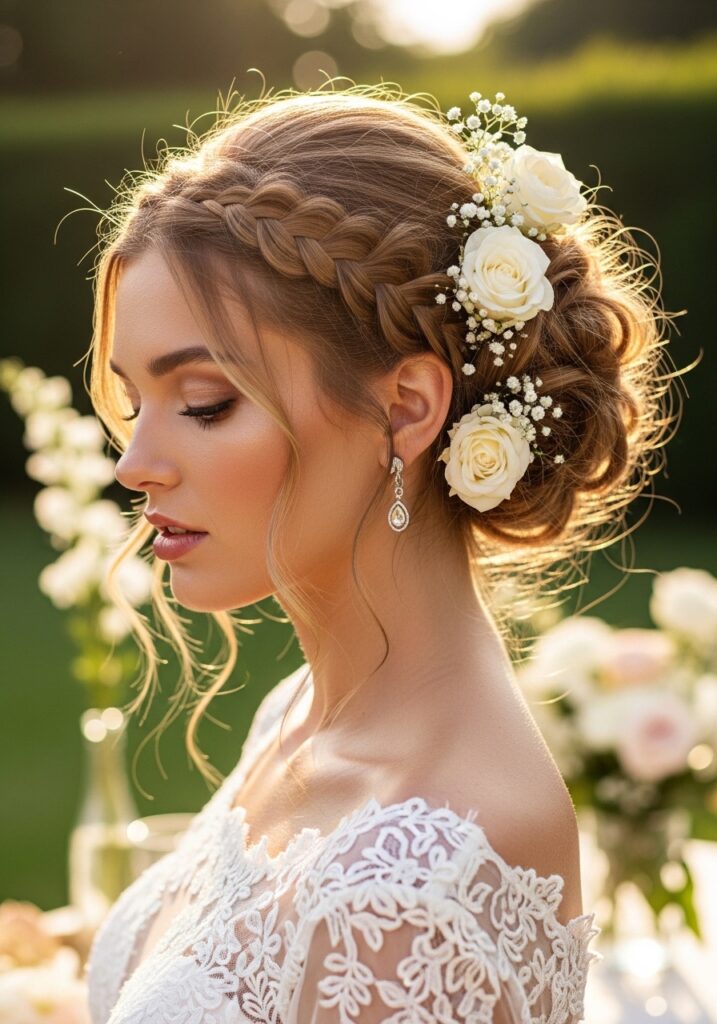 The romantic braided updo combines multiple delicate braids woven into a soft updo that feels dreamy and artistic. This hairstyle adds texture and visual interest while maintaining elegance. The braids create beautiful patterns throughout the hair, giving the style a handcrafted feel. Brides often enhance the design with pearl pins or tiny floral accents that sparkle gently in natural light. This hairstyle is especially popular for outdoor weddings and romantic venues because it complements nature inspired themes. The braided updo allows brides to look graceful, feminine, and unique while maintaining the refined elegance expected for their wedding celebration.