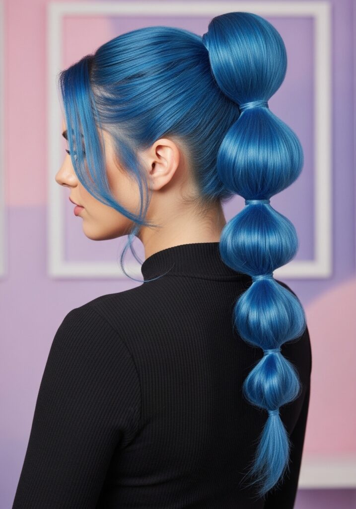 The bubble ponytail is a playful and trendy hairstyle that adds creativity to a simple ponytail. Start by tying your hair into a high or mid ponytail, then add additional elastics every few inches down the length. Gently pull each section outward to create rounded “bubble” shapes. This hairstyle looks unique while still being easy to create in minutes. It works best with long hair because the extra length allows more bubbles to form. The bubble ponytail is perfect for casual days, social events, or when you want a hairstyle that stands out in a fun and stylish way.