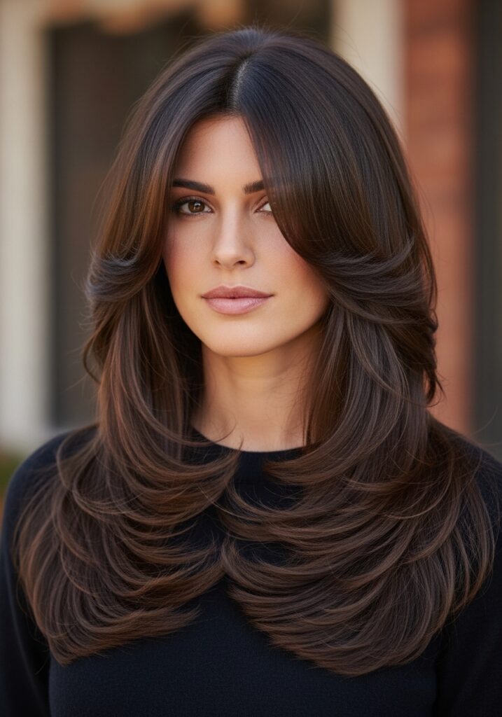 Soft layered waves are one of the most flattering hairstyles for long hair because they add movement, texture, and natural volume without looking overly styled. Layers help prevent long hair from appearing heavy while creating a light and flowing effect that frames the face beautifully. You can achieve this hairstyle with a curling wand or by braiding your hair overnight for heatless waves. A lightweight texturizing spray enhances the soft waves and keeps them looking fresh throughout the day. This hairstyle works perfectly for casual outings, office days, or evening events when you want an effortlessly elegant look.