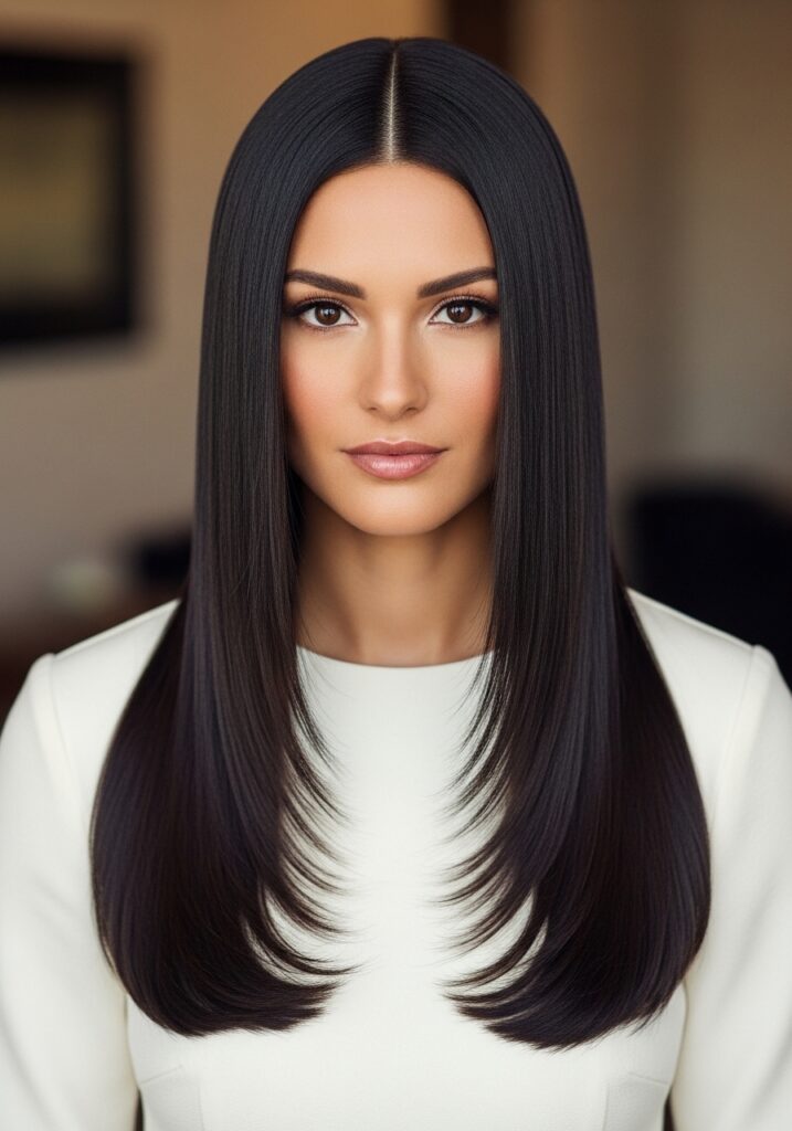 The sleek middle part hairstyle is a premier choice for achieving a balanced and modern look that naturally highlights facial symmetry and bone structure. This sophisticated style works especially well with long straight hair because the extended surface area emphasizes shine and smoothness, creating a mirror-like reflection. To achieve this high-fashion aesthetic, ensuring your strands are perfectly aligned is key; applying a small amount of serum can enhance the glossy finish while taming any flyaways for a flawless result. Whether you are aiming for a professional boardroom presence or a minimalist evening vibe, this look offers a streamlined silhouette that feels both powerful and refined. Ultimately, the sleek middle part is a timeless technique that transforms long, healthy hair into a bold statement of elegance and precision.