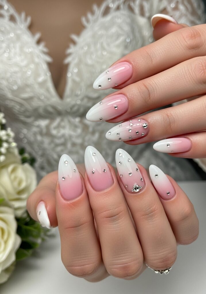 Ombre French bridal nails offer a modern upgrade to the classic French manicure. Instead of a sharp white tip, the design blends soft white polish gradually into a nude or blush base, creating a seamless gradient effect. The transition between colors looks smooth and dreamy, giving the nails a romantic and elegant appearance. This design is especially popular among brides who want a natural look that still feels polished and special. Ombre French nails complement almost every wedding dress style, from minimalist satin gowns to detailed lace dresses. Many brides also add small crystals, pearl accents, or subtle glitter for extra dimension. The soft gradient effect photographs beautifully, making the nails look delicate and refined in wedding pictures. If you love classic bridal beauty but want something slightly more modern, ombre French nails provide a stunning and sophisticated choice.