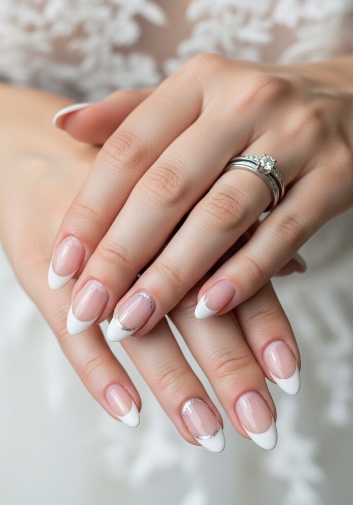 Classic French bridal nails remain one of the most timeless choices for brides who love elegance and simplicity. This design features a soft pink or nude base paired with crisp white tips, creating a clean and polished look that complements almost any wedding dress. The beauty of French nails lies in their versatility—they look equally stunning with minimalist gowns, lace dresses, or glamorous ball gowns. Brides often enhance this design with subtle details like micro glitter lines, pearl accents, or delicate rhinestones for a modern twist. Because French manicures are neutral, they photograph beautifully during ring close-ups and bouquet shots. If you want a nail design that will never feel outdated when you look back at your wedding album years later, this is a perfect choice. Elegant, graceful, and effortlessly chic, classic French bridal nails capture the essence of bridal beauty while remaining understated and sophisticated.