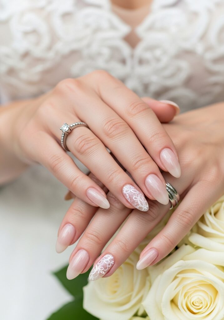 Lace inspired bridal nails are perfect for brides who want their manicure to match the intricate beauty of their wedding gown. This design features delicate lace patterns painted over soft nude, ivory, or blush bases, creating a romantic and vintage-inspired effect. Nail artists often use fine brushes or stamping techniques to recreate floral lace details that resemble real bridal fabrics. The result is a manicure that feels artistic, elegant, and incredibly bridal. Lace nail designs pair beautifully with classic wedding dresses, cathedral veils, and romantic wedding themes. Some brides add small rhinestones or micro pearls to mimic the sparkle of embroidered lace gowns. Because lace patterns are delicate and refined, they enhance the overall bridal aesthetic without feeling too bold. When photographed, lace nails look stunning alongside bouquets and rings, making them a beautiful detail that ties together your entire wedding day style.
