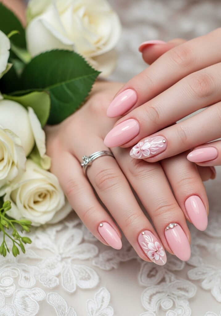 Soft blush pink nails are a romantic and feminine option that perfectly complements bridal elegance. This delicate shade resembles the natural color of healthy nails while adding a subtle rosy glow that enhances your hands. Blush pink manicures are especially popular for brides who want something natural yet polished. The color pairs beautifully with white dresses, ivory gowns, and champagne wedding themes. Many brides elevate this look by adding tiny crystals, pearl accents, or delicate floral nail art on one accent nail. The softness of the shade keeps the design refined while still feeling special for the occasion. Another advantage of blush pink nails is their ability to flatter every skin tone, making them universally beautiful. In wedding photos, this gentle color appears graceful and sophisticated without distracting from the engagement ring. If you love romantic bridal aesthetics, soft blush pink nails offer timeless charm with a modern touch.
